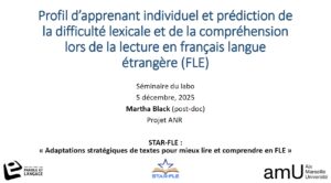 Séminaire donné par Martha Black (post-doctorante) à l’ensemble de la communauté du Laboratoire Parole et Langage (LPL), intitulé « Profil d’apprenant individuel et prédiction de la difficulté lexicale et de la compréhension lors de la lecture en français langue étrangère (FLE) ». Cette présentation a porté sur la manière dont la difficulté lexicale en lecture est perçue par les apprenants adultes de français, ainsi que sur la façon dont ces perceptions variaient selon les profils individuels. À partir des données du projet ANR STAR-FLE (Adaptations stratégiques de textes pour mieux lire et comprendre en FLE), l’interaction entre les propriétés linguistiques des mots et divers facteurs individuels — tels que la motivation, l’expérience linguistique préalable et les styles d’apprentissage — a été analysée. Les résultats de modèles statistiques prédictifs ont été présentés afin d’identifier quels items étaient les plus difficiles, pour quels types d’apprenants, et selon quelles dynamiques. Le concept émergent de « profil individuel d’apprenant » pour comprendre la difficulté lexicale a également été introduit. Enfin, des implications pédagogiques pour la conception de dispositifs de lecture adaptatifs et personnalisés ont été discutées.
